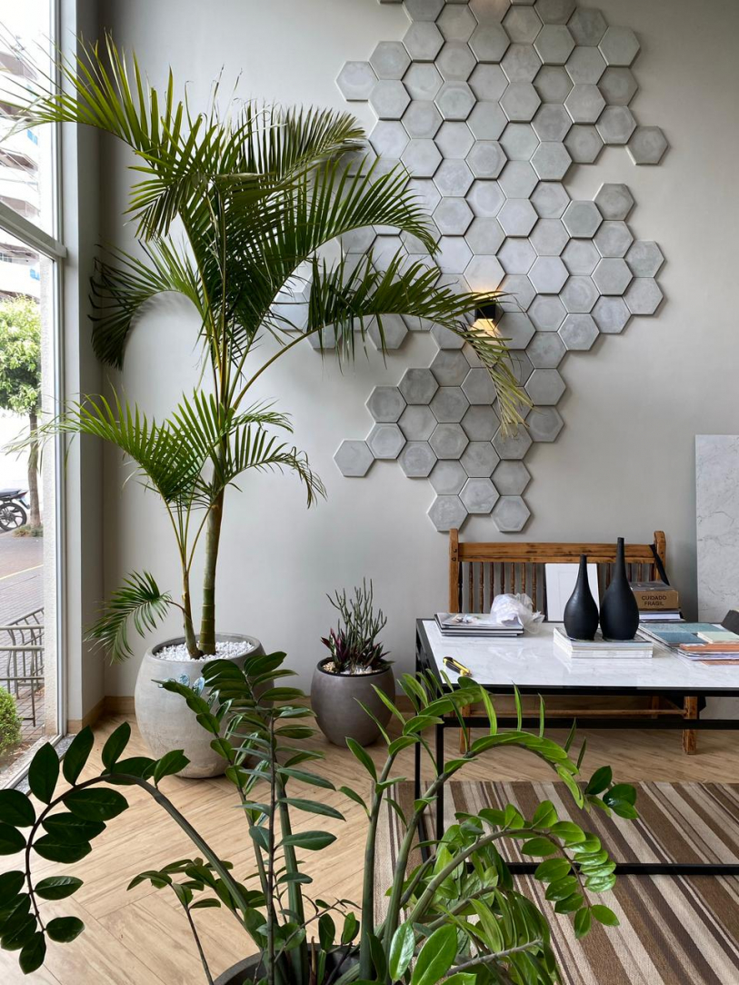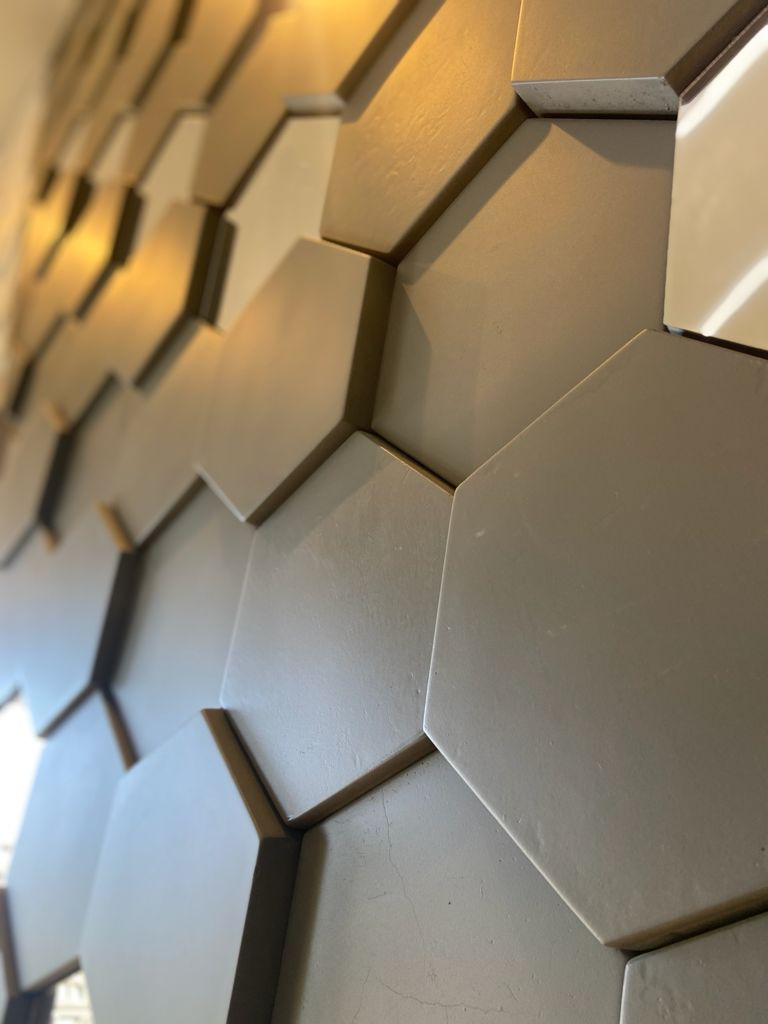 De formas hexagonais, o revestimento Jade traz consigo, ainda, variações de altura que permitem composições únicas. Também disponível em acabamento espelhado, este modelo pode ser utilizado para preenchimento total da parede ou áreas específicas.