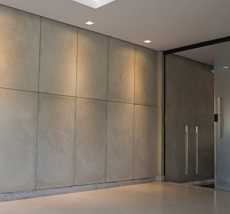 O Revestimento Liscio traz em sua sóbria composição as características do concreto aparente em grandes dimensões. De utilização monumental, pode ser instalado em áreas internas ou externas.