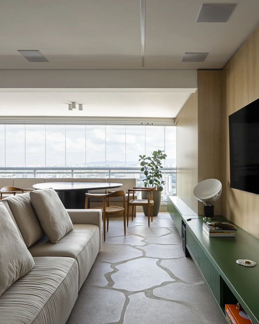 O piso orgânico Três Marias agrega versatilidade através de sua paginação que explora a textura e sinuosidade. O cimentício incorpora originalidade a distintos ambientes, trazendo personalidade e elegância à obra.